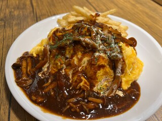 たっぷりのきのこをデミグラスソースで煮込んでオムライスにかけました。