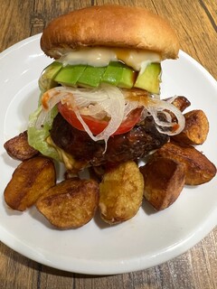 肉厚国産牛のパテをてりやきにして,たっぷりの生アボカドをはさみました。
