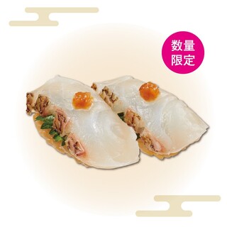 <水戸の梅まつり:2/11(水・祝)~3/22(日)> しそと真鯛を一緒に握り、梅をトッピングした相性抜群のさっぱりとしたメニューです。 ※数量限定 ※3/4から「梅しそ桜鯛」に変更となります。