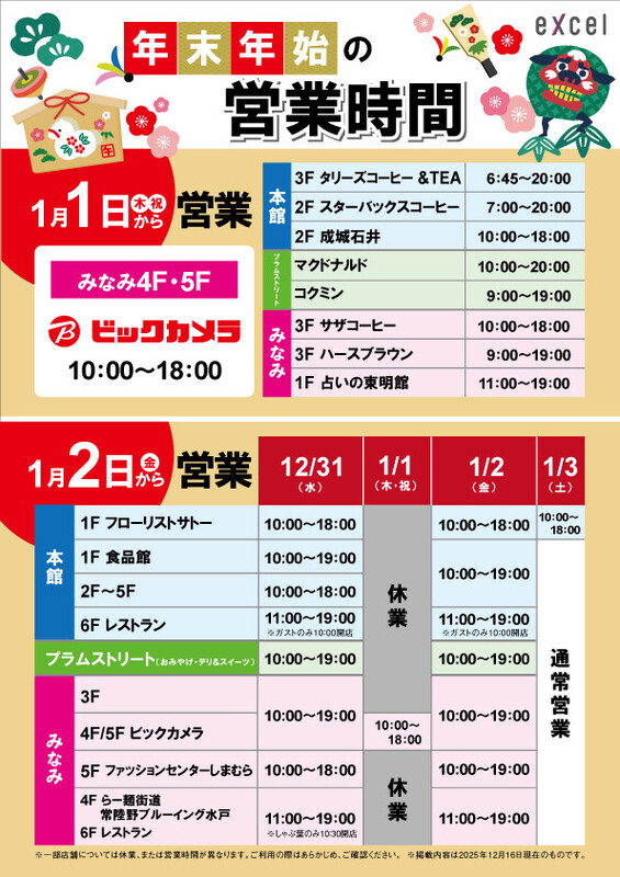いつも水戸駅ビルエクセル・エクセルみなみをご利用いただき、誠にありがとうございます。