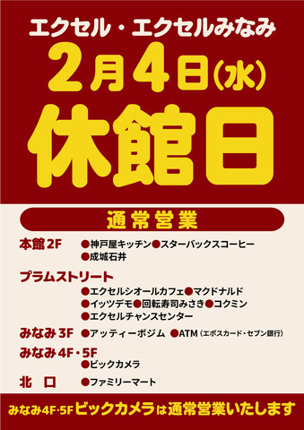 エクセル・エクセルみなみ2月4日(水)休館日のおしらせ