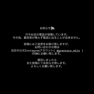 只今お店の電話が故障しています。 その為、着信音が鳴らず電話に出ることが出来ません。 皆様にはご迷惑をお掛け致しますが、 お問い合わせの際は 当店の公式Instagramアカウント( @gransacs_mito ) のDMにお願い致します。 復旧しましたら また投稿にてお知らせ致します。 よろしくお願い致します。