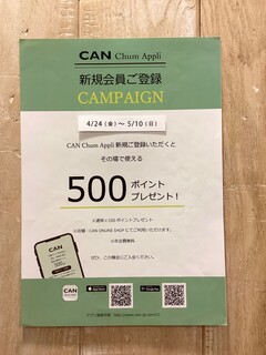 開催期間:4/24(金)〜5/10(日) 期間中にCAN chumアプリを新規ご登録いただくと その場で使える《500ポイント》をプレゼント🎁 ⚠︎通常=100ポイント▶️キャンペーン期間中=500ポイント ⚠︎1ポイント=1円分としてご利用いただけます (店舗・CAN ONLINE SHOP共通) ⚠︎そのほかにもスタンプを集めて割引クーポンプレゼントや バースデークーポンなどお得な特典付き! お得にポイントが貰えるこの期間にぜひご入会くださいませ。 ご来店を心よりお待ちしております🎵