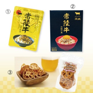 <水戸の梅まつり:2/11(水・祝)~3/22(日)> ①常陸牛ふりかけ(30g) ②常陸牛 牛飯の具(120g/2合用) ③宮本農園の手揚げれんこんちっぷ(ピンクソルト・しょうゆ・あおのり)