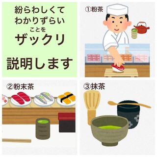 粉茶・粉末茶・抹茶の違いは微妙でわかりずらいもの。簡単に、ザックリと説明しました。イメージとして覚えていただけると、嬉しいです。 【🍵粉茶・粉末茶・抹茶の違い🌱】 ①粉茶→急須が必要 お寿司屋さんで上がりのお茶として出されるのはこちら ②粉末茶→急須必要無し お湯で溶かすインスタントタイプ。回るお寿司屋さんのお茶はこちら ……………………………… ③抹茶→主に茶道用。①②とは別物