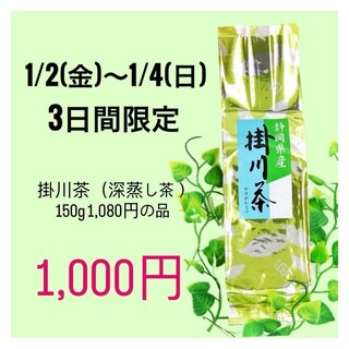 毎年恒例の「初売りお得得情報」です。 当店人気No.1 掛川茶150g詰のお茶を 3日間限定で さらにお買い得にいたします 静岡県 掛川産の深蒸し茶は ①濃い色と味 ②高い香り で人気が高く、特にご家庭用におすすめ。 この機会をお見逃しなく、ぜひご利用ください。 【自店ポイント2倍】は1/10まで こちらも合わせてご利用ください。