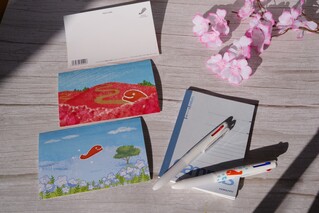 ポストカード 各110円 ・ネモフィラ柄 ・コキア柄 ボールペン 450円 くじらの大ちゃんとネモフィラ柄の3色ボールペンです🖊
