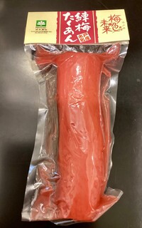 天日干しでじっくりと干し上げた1本干しの大根に梅肉で漬け込み、練り梅の風味を利かせた個性豊かな沢庵です。梅の程よい酸味と沢庵のパリパリとした食感をお楽しみ下さい。