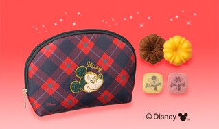 もこもこしたさがら刺繍の「ミッキーマウス」がかわいいチェック柄のポーチに、お花形のフルーリマドレーヌと、クッキーをアソートしました♪