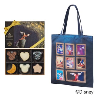 「ゴディバ『ファンタジア』コレクション」アソートメント 6粒入とショッピングバッグのスペシャルなセットです。持ち歩きにも便利なポーチ付きのショッピングバッグは、『ファンタジア』の1コマを描いたオリジナルデザイン。このコレクションだけの限定アイテムです。 同時期に展開する「チャーム」を付けていただくと、よりいっそう『ファンタジア』の世界をお楽しみいただけます。