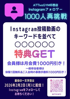 アッティーボジム印西店 Instagramフォロワー数1000人再挑戦に向けてキャンペーンを実施しております! <キャンペーン内容> 2月2日(月)から6日間 アッティーボジム各店舗のInstagram投稿動画にてキーワードを1文字ずつ配信! 合計6文字のキーワードを並び変えて正解にチャレンジ💪 答えが分かった方は、各店舗のLINEへ 【キーワード6文字のみ】をスペースなしで送信! 入力例)おたのしみに ⚠キーワード送信対応期間⚠ 【アッティーボジム会員様】 2026年2月7日(土)~2026年2月15日(日) 【一般参加者様】 2026年2月7日(土)~2026年2月28日(土) 正解された方には... 【アッティーボジム会員様】 月会費1000円引きクーポンプレゼント🎁 【一般参加者様】 体験1回無料クーポン&ご入会時の事務手数料1000円引きクーポンプレゼント🎁 Instagramをフォローして配信をご覧ください✨ https://www.instagram.com/attivo.mito/ ↑ 動画はこちらから😊 皆様のご来店お待ちしております!