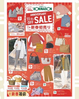 あけましておめでとうございます! ただいまボンメゾンでは新春初売りがスタートしております! 初売りセールでは55周年を記念してMAX55%OFFの商品も☻ 皆様のご来店心よりお待ちしております!!
