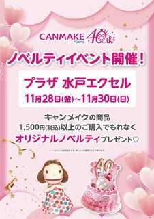 11月28日(金)~11月30日(日) の期間中、 プラザ水戸エクセル店でCANMAKEノベルティ イベント開催いたします! キャンメイクの商品を1,500円(税込)以上のご購入で もれなくオリジナルノベルティをプレゼント♪♪♪ ※ノベルティは数量限定です。 無くなり次第終了させて頂きます。 ぜひこのお得な機会に、お買い物をお楽しみください!