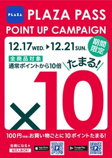 いつも PLAZA をご利用いただきありがとうございます。 12/17(水)~12/21(日)の期間中、 PLAZA PASS 本会員様限定で、全商品ポイント10倍キャンペーンを開催! 通常100円(税抜)ごとに1ポイントのところ、10倍でおトクにゲットするチャンスです! お会計の際に PLAZA PASS (アプリまたはカード)をご提示ください。 当日新規でご入会された方も対象となります。 この機会をお見逃しなく!みなさまのご来店を心よりお待ちしております! ※キャンペーンポイントの後付けはできかねます。
